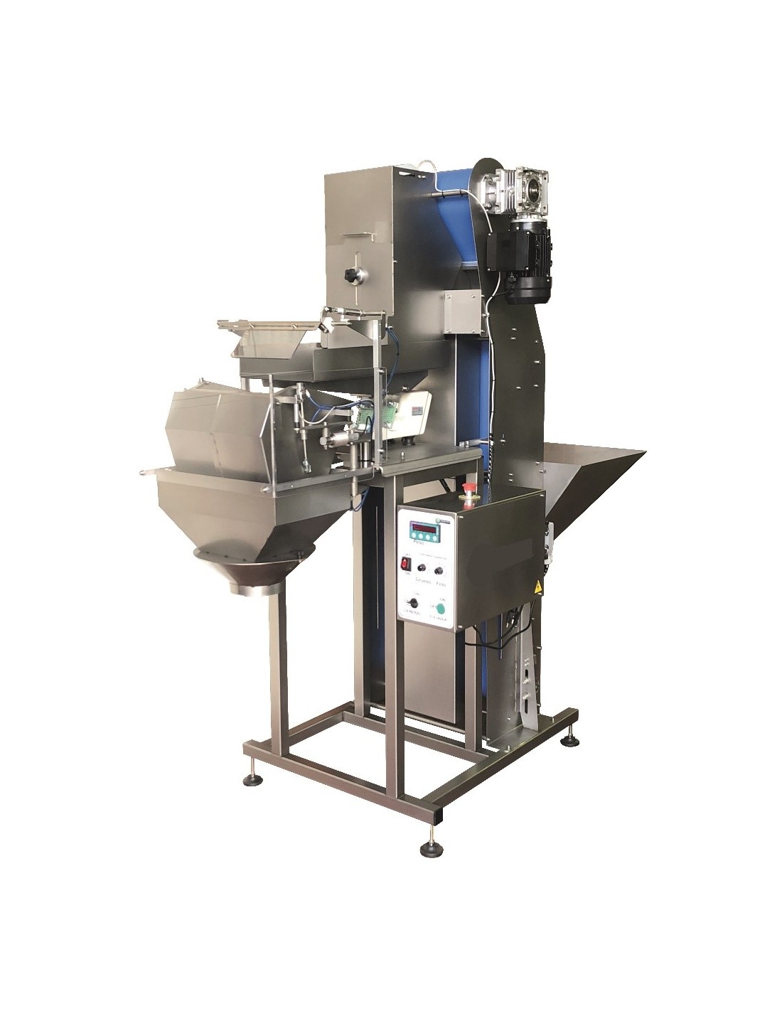 Fabricada en acer inoxidable AISI-304, aquesta màquina pot funcionar en automàtic adaptada a una envasadora vertical, però també és molt habitual veure-la en línies semiautomàtiques, funcionant en combinació amb una segelladora en continu.