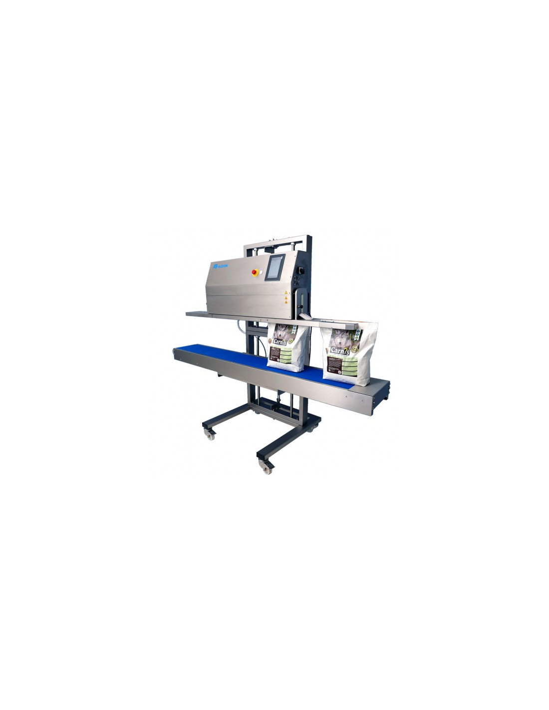 La máquina puede instalarse sobre un sistema de cinta transportadora existente o puede equiparse con una cinta transportadora opcional fijada a un soporte (motorizado). La altura de la máquina y de la cinta transportadora es fácilmente ajustable (mecánica o eléctricamente), lo que permite sellar lotes de bolsas de diferentes tamaños.