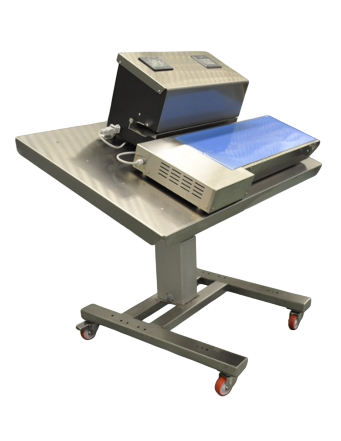 Disponible como selladora térmica de sobremesa o montada sobre un soporte con ruedas con altura e inclinación ajustables.